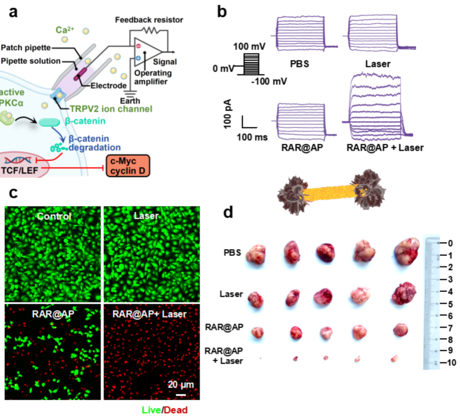 第二种纳米平台是针对肝癌干细胞的哑铃状Rh-Au-Rh纳米棒(RAR@AP)。该平台通过光热效应激活高阈值的TRPV2离子通道,引发细胞内的钙信号紊乱,进而抑制肿瘤干细胞的自我更新与增殖能力,从根源上消除肿瘤的再生潜力(参考文献[3])。