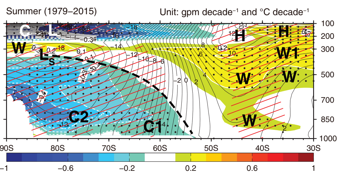 ·南极环流与极地环流的协同作用,使得南半球高纬度(53S以南)对流层中下部出现显著降温(中心降温速度达 -1℃/10 年),且降温趋势直接传导至地面 [2]。