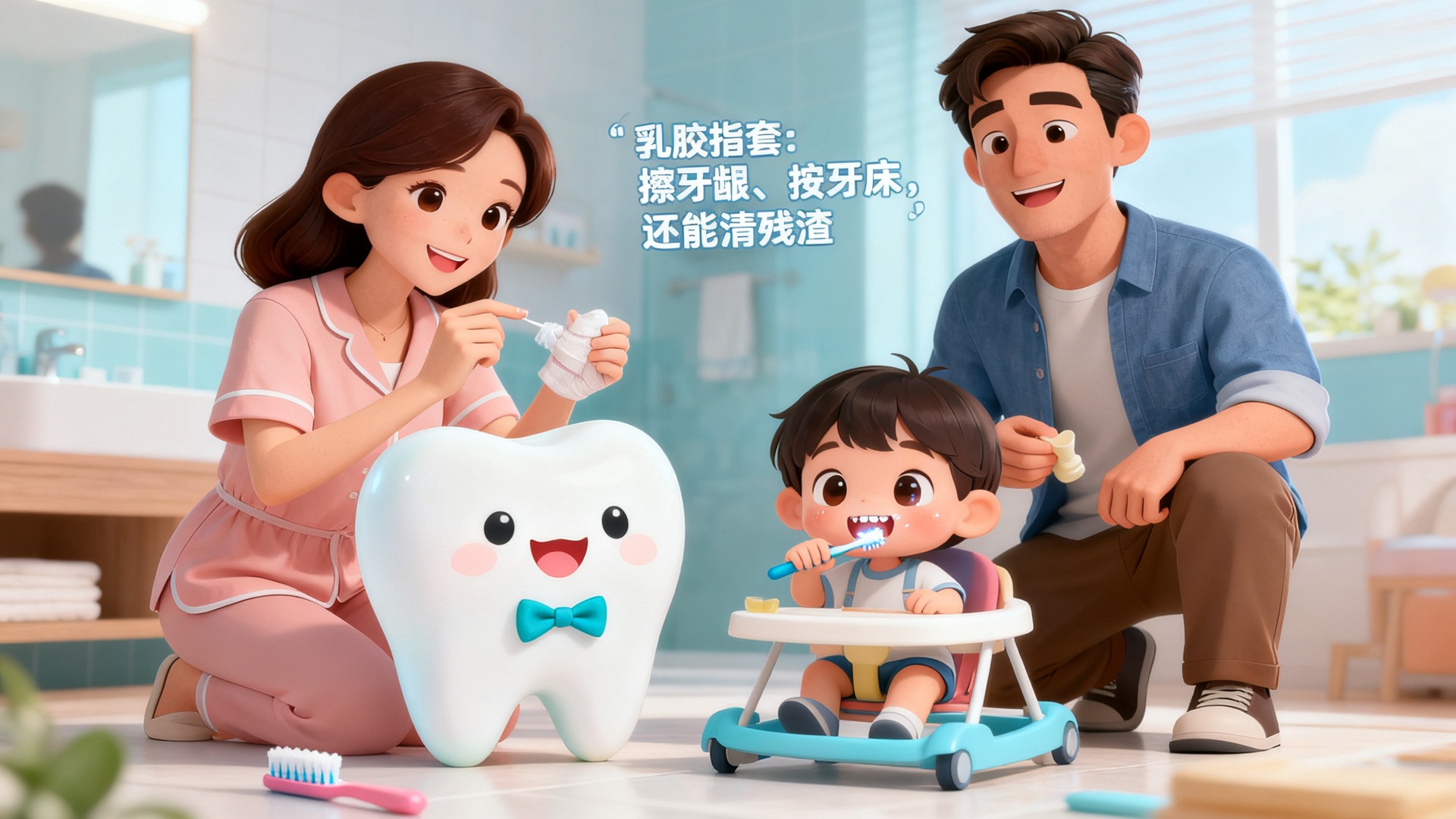 6个月左右第一颗乳牙冒出来啦,每天用纱布擦1-2次牙面,再用指套按摩牙龈,舒服又干净~”