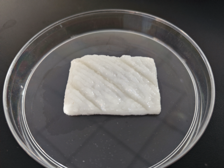 更令人振奋的是,浙江大学刘东红教授、陈军教授牵头团队联合大连工业大学朱蓓薇院士团队,进一步实现突破:耗时17天成功合成国内首例厘米级细胞培养大黄鱼组织仿真鱼排。最终成品的硬度、弹性等指标与真鱼几乎一致。