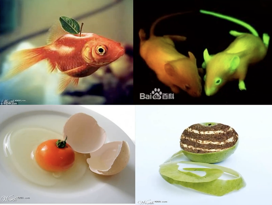 先给大家做一个小测试:金鱼长树叶、老鼠发荧光、鸡蛋含番茄、苹果含蛋糕——哪一个是真实的基因编辑成果?
