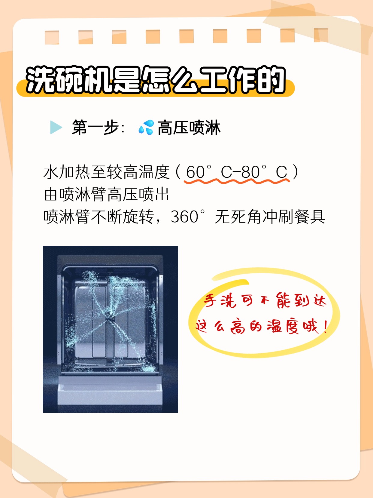 •高压喷淋:将水加热至较高温度(60°C-80°C),然后通过内置的喷淋臂高压喷出。喷淋臂在水流的反作用力下会不断旋转,无死角地冲刷餐具的各个角落。这可是手洗所不能达到的高温,清洁力自然增长了!