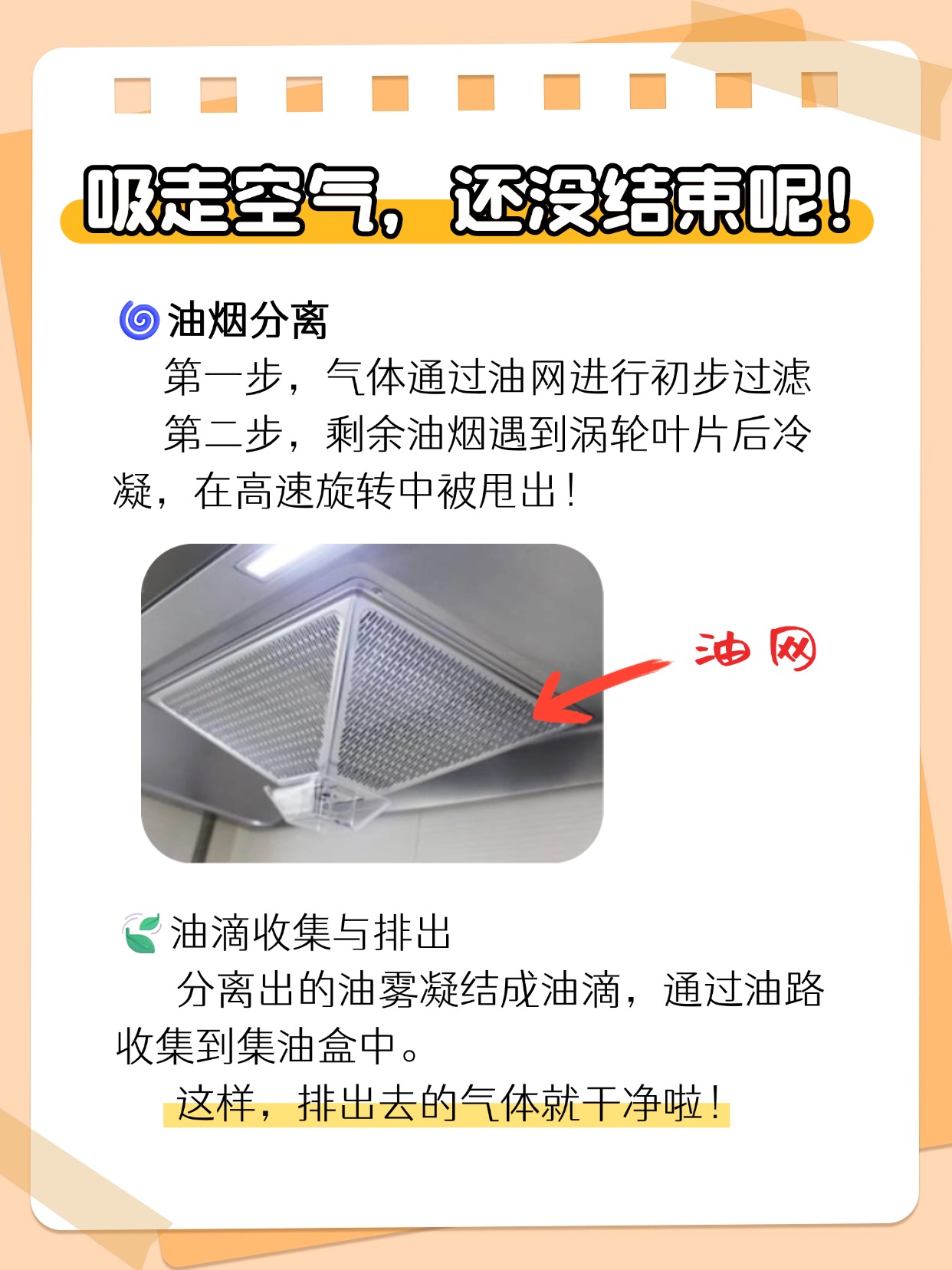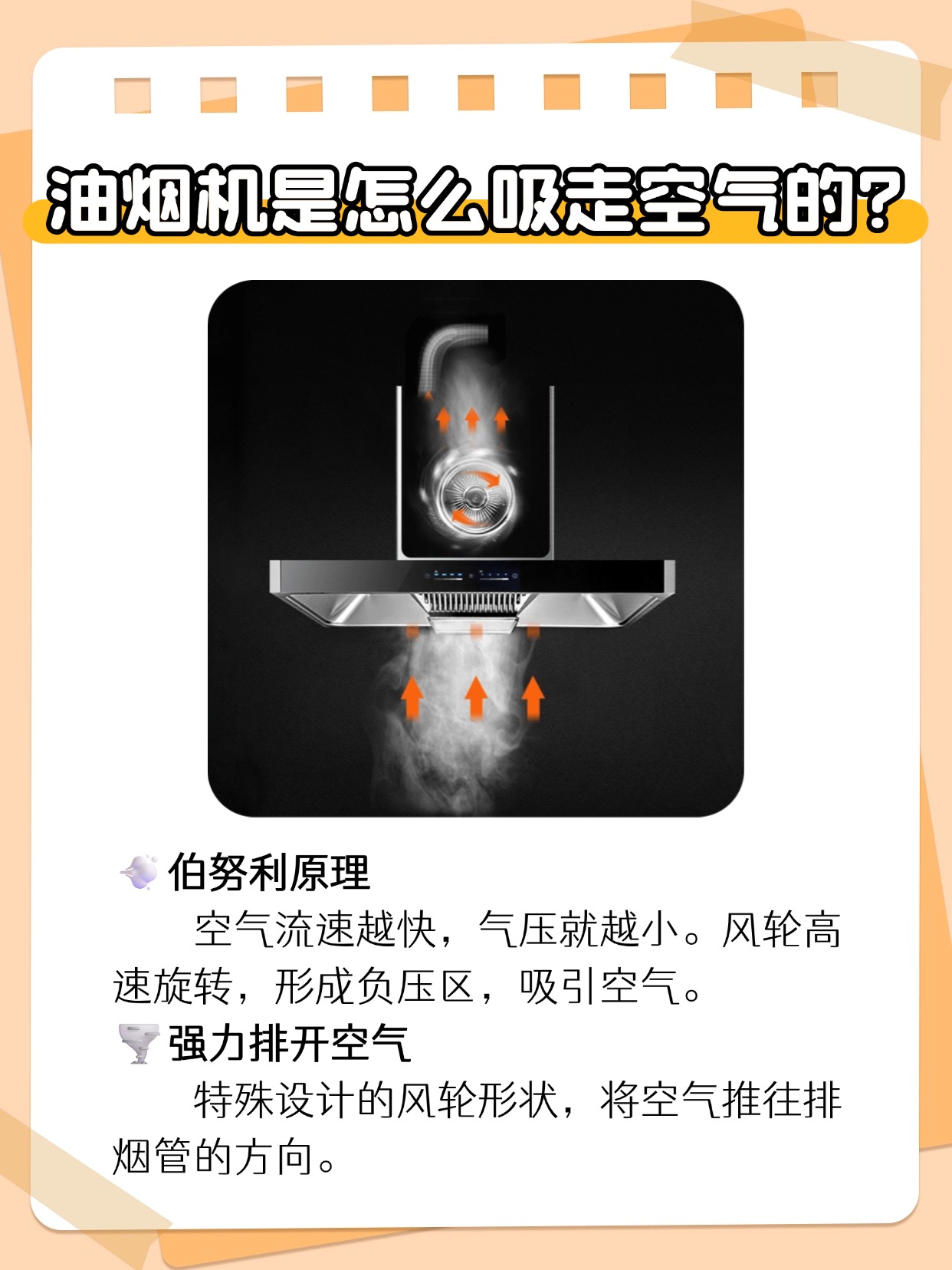 •️强力排开空气:油烟机的风轮叶片形状是特殊设计的!旋转起来,将空气推往排烟管的方向,灶台一侧就形成了多余的空间,把空气“吸”走。