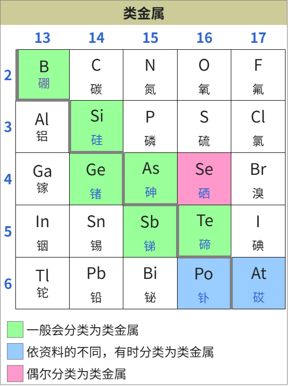 在元素周期表的金属与非金属阵营之间,存在着一个独特的“跨界”家族——准金属,它们也常被称为“类金属”。顾名思义,它们的特性介于典型的金属和非金属之间,甚至能兼具二者之长。尽管科学家们对它们的界定没有绝对统一的标准,但硼(B)、硅(Si)、锗(Ge)、砷(As)、锑(Sb)和碲(Te)等通常被认为是这个家族的核心成员。