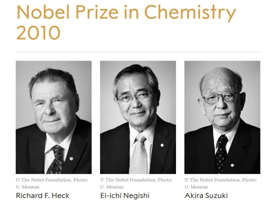 2010年诺贝尔化学奖共同授予Heck、Negishi和Suzuki,以表彰他们在“有机合成领域中钯催化交叉偶联反应”方面的贡献