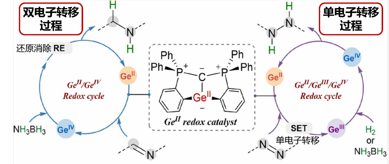 尤为重要的是,机理研究揭示了同一锗催化剂可遵循两种不同的催化模式:在催化偶氮苯氢化时,反应经历涉及GeII/GeIII/GeIV循环的自由基(单电子转移)路径;而在催化亚胺氢化时,则经由单个锗中心完成的GeII/GeIV双电子循环。该研究首次实现了在同一低价锗体系中同时涵盖单电子与双电子转移的催化路径,为准金属模拟过渡金属的多样化催化行为提供了关键证据。