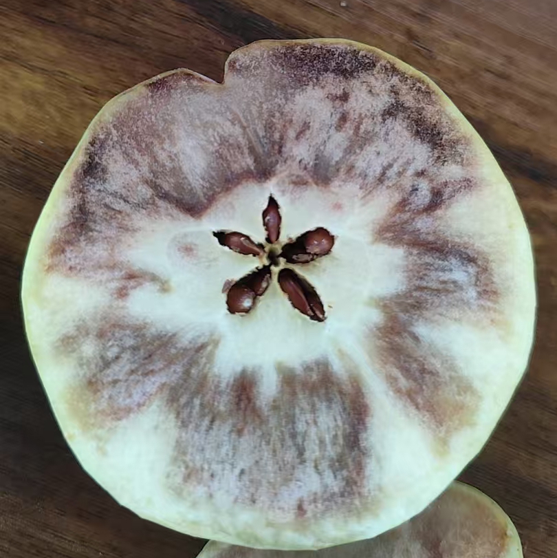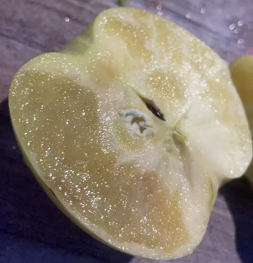 解剖特征:病部集中于果心周围及维管束附近,果肉细胞间隙充满透明汁液,形成半透明斑块,严重时可扩展至整个果肉。病组织质地较硬,风味偏甜但伴随轻微酒味,后期易发生褐变与霉变。