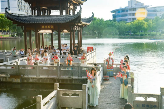夜幕渐深,流光溢彩的灯光将校园装点得如江南夜色般浪漫。活动第三章“九天钧乐奏云韶”在湖畔精彩上演,青年师生化身黄梅戏演员,身着精致戏服,粉墨登场。婉转悠扬的唱腔与细腻传神的表演,将黄梅戏的声腔韵味演绎得淋漓尽致。师生们聆听着这来自徽州大地的天籁之音。微风拂过湖面,泛起粼粼波光,与黄梅戏的雅韵交织在一起,营造出如诗如画的氛围。现场还开展了源自皖南泾县桃花潭的徽式龙舟竞渡活动,龙舟如离弦之箭般向前冲刺,岸边师生的呐喊助威声此起彼伏,将活动氛围再次推向高潮。