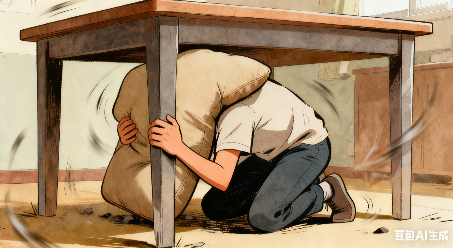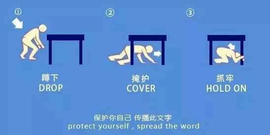 用一只手紧紧抓住你躲藏的家具的支撑腿(桌腿等),另一只手持续护住头颈。在整个晃动持续期间,都要保持这个姿势。因为地震的晃动是持续且方向多变的。你藏身的桌子可能会随之滑动。紧紧抓牢它是为了确保这个生命的“保护罩”始终在你的上方,不会在晃动中偏离,将你暴露在外。