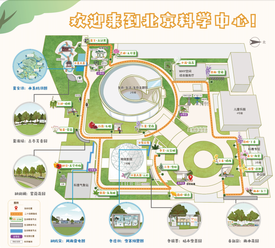 “我们以‘一轴两环、三生四季、二十四景’为空间脉络,以二十四节气为时序线索,设计了这条户外科学教育路线。”王云翔介绍道,“它与主展馆‘生命、生活、生存’的主题相呼应,并融合了自然景观、科技文化和北京地域特色。