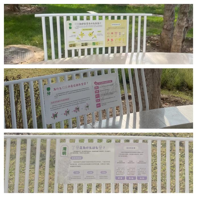 这种“边走边学、边看边思”的体验贯穿始终。在“惊蛰”节气点的长椅旁,题为“连翘和迎春花有什么区别?”的展板引人驻足阅读;移步“春分”节气点,“为什么海棠开花后颜色变淡?”的疑问在展板上找到了答案;而在“清明”节气点,不仅能了解“丁香花为什么这么香?”的科学原理,还能通过阅读中国科学院植物研究所吴静团队的研究故事,切身感悟“求实、创新、协同”的科学家精神。
