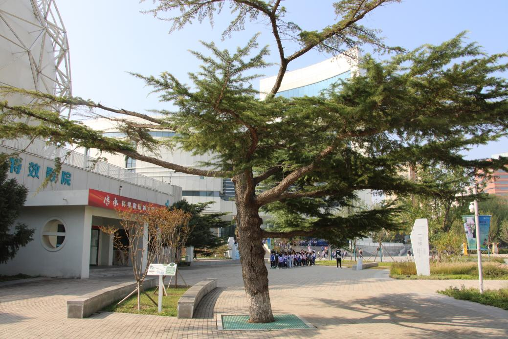 即便到了冬季,户外课堂也不会停歇。一棵形态独特的雪松引起大家好奇,它的枝干朝向与常见松树迥然不同。“这棵雪松曾因地铁施工导致根系受损,从而影响了整体的生长形态。”一旁的展板不仅分析了雪松独特的形态成因,还引出了中国工程院院士束怀瑞研究果树“根系密码”的科学故事。