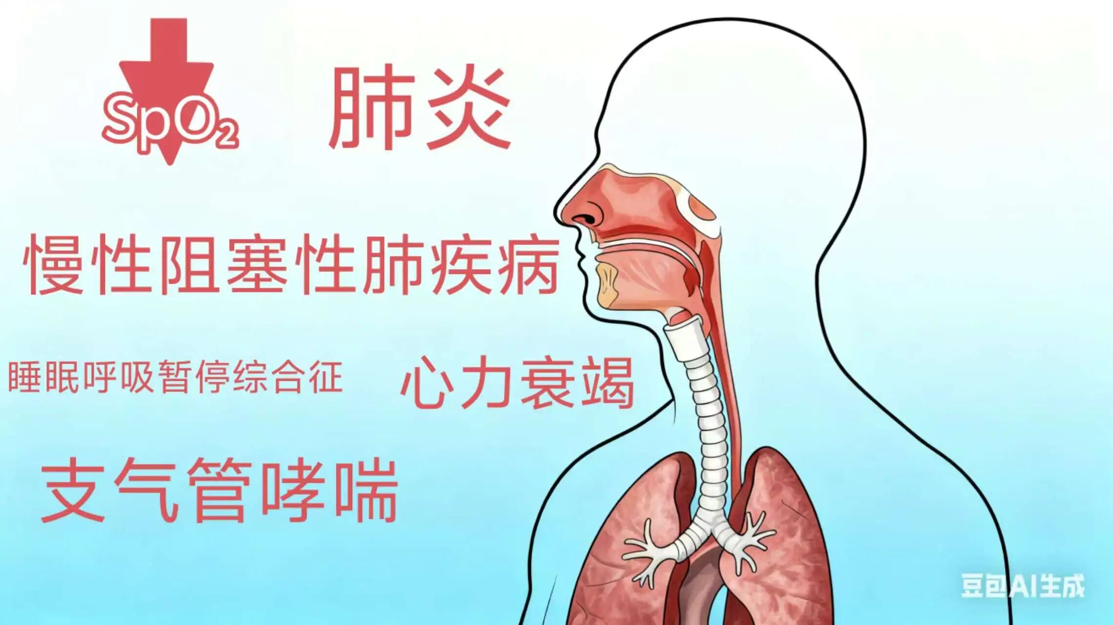 当 SpO₂数值过低时,提示身体可能处于缺氧状态,常见于肺炎、支气管哮喘、慢性阻塞性肺疾病(COPD)、心力衰竭、睡眠呼吸暂停综合征等呼吸系统或循环系统疾病,需结合患者症状进一步明确病因。
