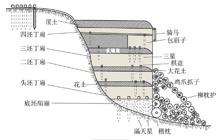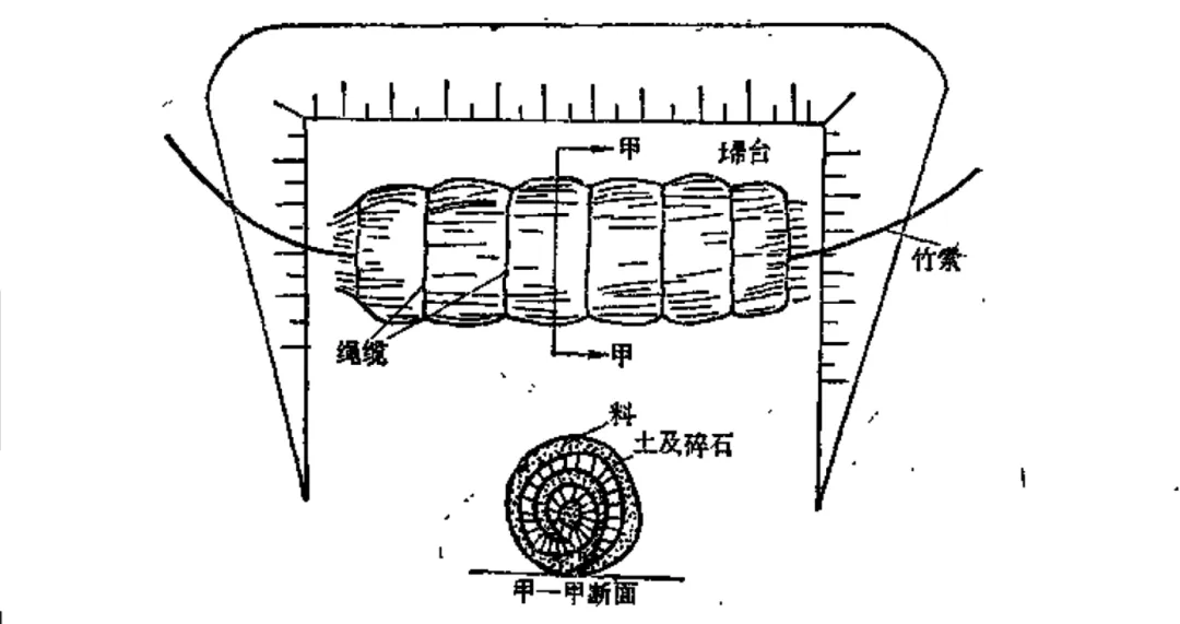 沿地面密铺草绳,草绳上铺以梢枝、芦苇之类的软料,软料上压土一层,并掺以碎石,再将大竹索横贯其间,即所谓的“心索”。