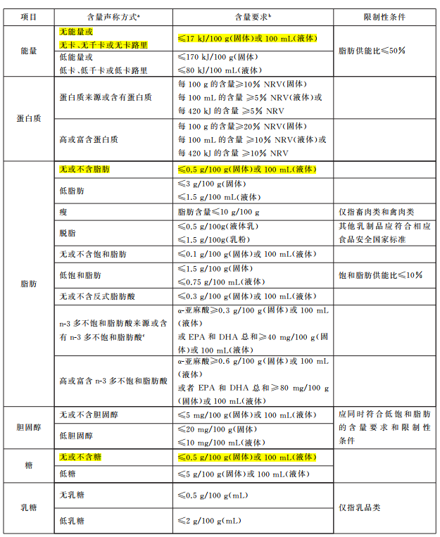 图5 GB 28050—2025中能量和营养成分含量声称的要求和限制性条件