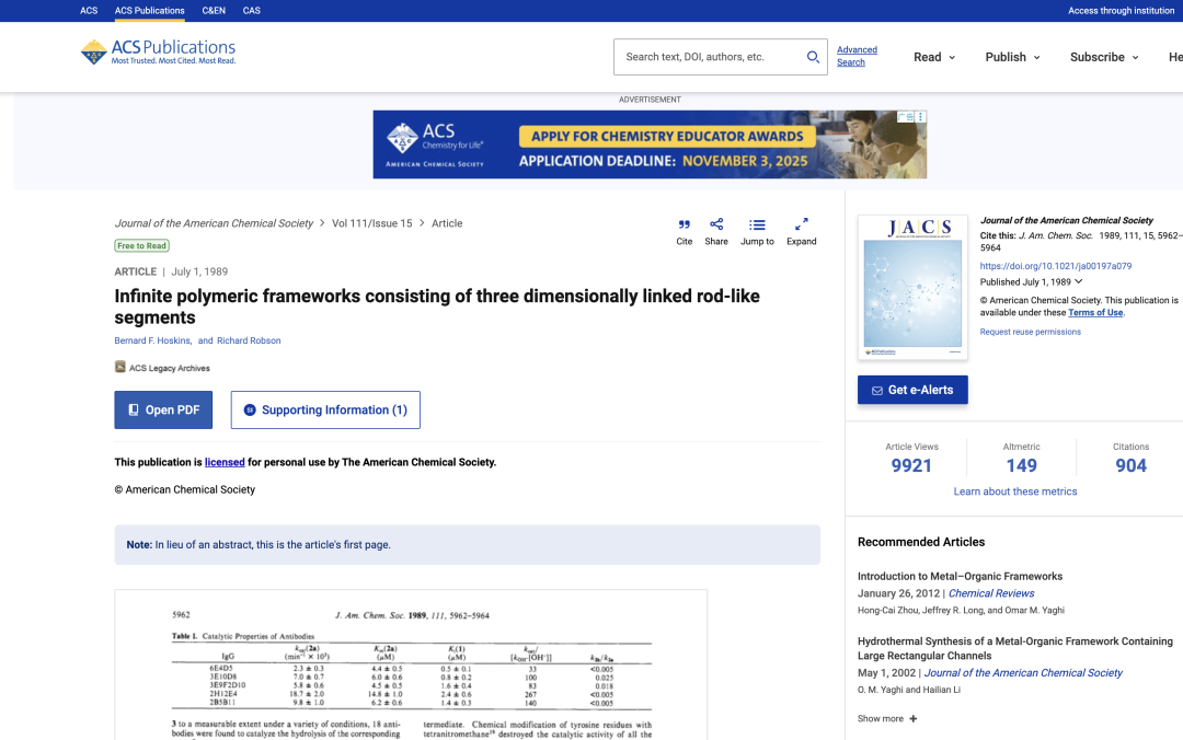 这一研究成果以「Infinite Polymeric Frameworks Consisting of Three Dimensionally Linked Rod-like Segments」为题,发表在《美国化学会志》(Journal of the American Chemical Society,JACS)上。其中,Robson 合作的早期作者之一 Ben F. Hoskins ,参与发表了这篇开创性论文,为 MOF 的概念萌芽提供了第一手实验证据。