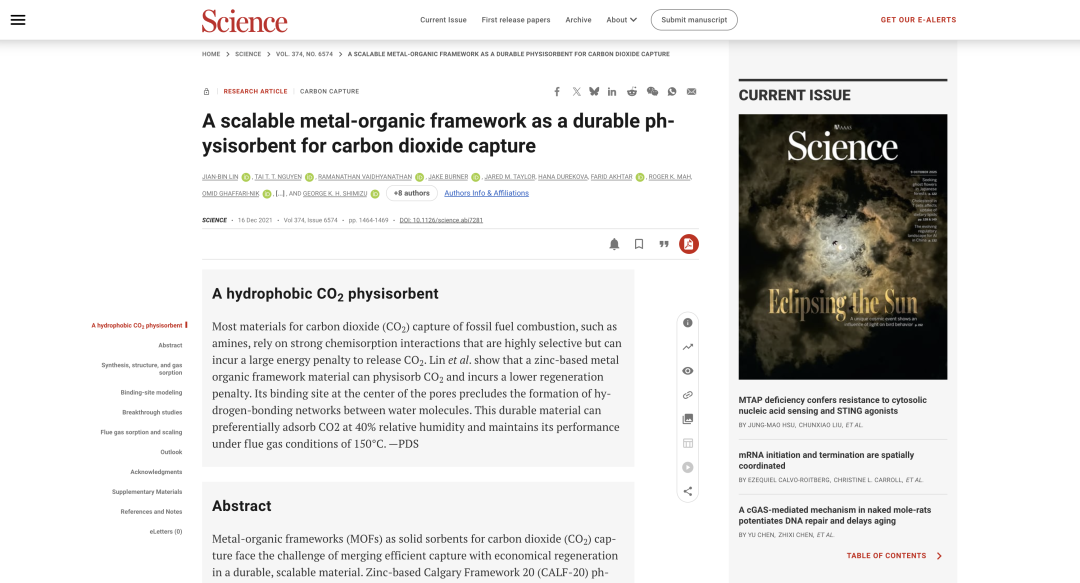 最近 10 年,MOF 被广泛用于工业碳捕获。例如,卡尔加里大学的 George Shimizu 课题组开发了一种名为 CALF-20 的 MOF 材料。该课题组发表在 Science 的论文中提到,CALF-20 可以在含水、氧化性、废气条件下仍保持性能,不同于以往许多 MOF 在湿气环境中容易失活的缺陷。因此,CALF-20 被加拿大 Svante 公司用于捕获二氧化碳,以去除水泥生产尾气中的温室气体。此外,电子行业也开始使用 MOF 材料吸收半导体生产过程中的部分有毒气体。