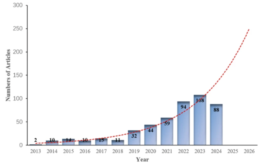 在人工智能与各领域的融合浪潮下,许多研究者也纷纷开始探索「AI+MOF 」的更多可能。此前,南昌大学尤志鹏团队发表了以「Artificial Intelligence in Metal–Organic Frameworks from 2013 to 2024: A Bibliometric Analysis」为题的论文,采用文献计量学方法和知识图谱可视化软件,对 2013 年至 2024 年中期 Web of Science 数据库中有关MOFs AI 的科研论文进行分析。从拟合曲线看,研究人员对 MOFs 中的人工智能领域的兴趣日益浓厚。从 2016 年起,「AI + MOF 」研究更是迎来了爆发式增长,文献数量持续上升,显示出这一交叉方向值得关注的前景。