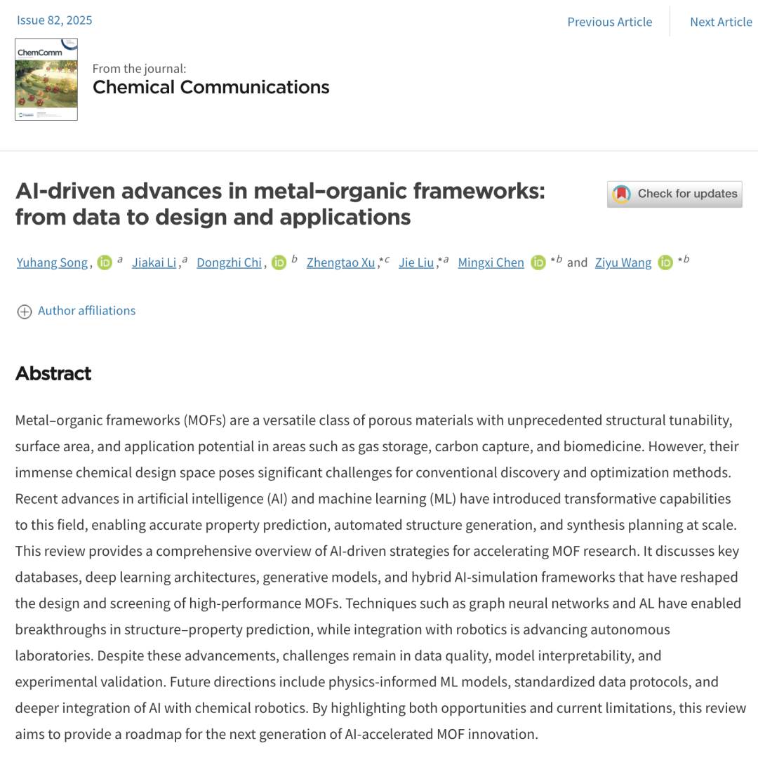 天津理工大学、中国科学院和新加坡科技研究局团队在联合发表的论文「AI-driven Advances in Metal–organic Frameworks: from Data to Design and Applications」中提到,「人工智能和机器学习的最新进展为 MOF 领域带来了变革性的能力,关键数据库、深度学习架构、生成模型和混合人工智能模拟框架重塑了高性能 MOF 设计和筛选,实现了准确的属性预测、自动化的结构生成和大规模的合成规划。」而事实上,在过去 5 年,许多研究团队确实已经基于 AI 在 MOF 结构的属性预测、自动化生成等细分领域取得了阶段性成果。