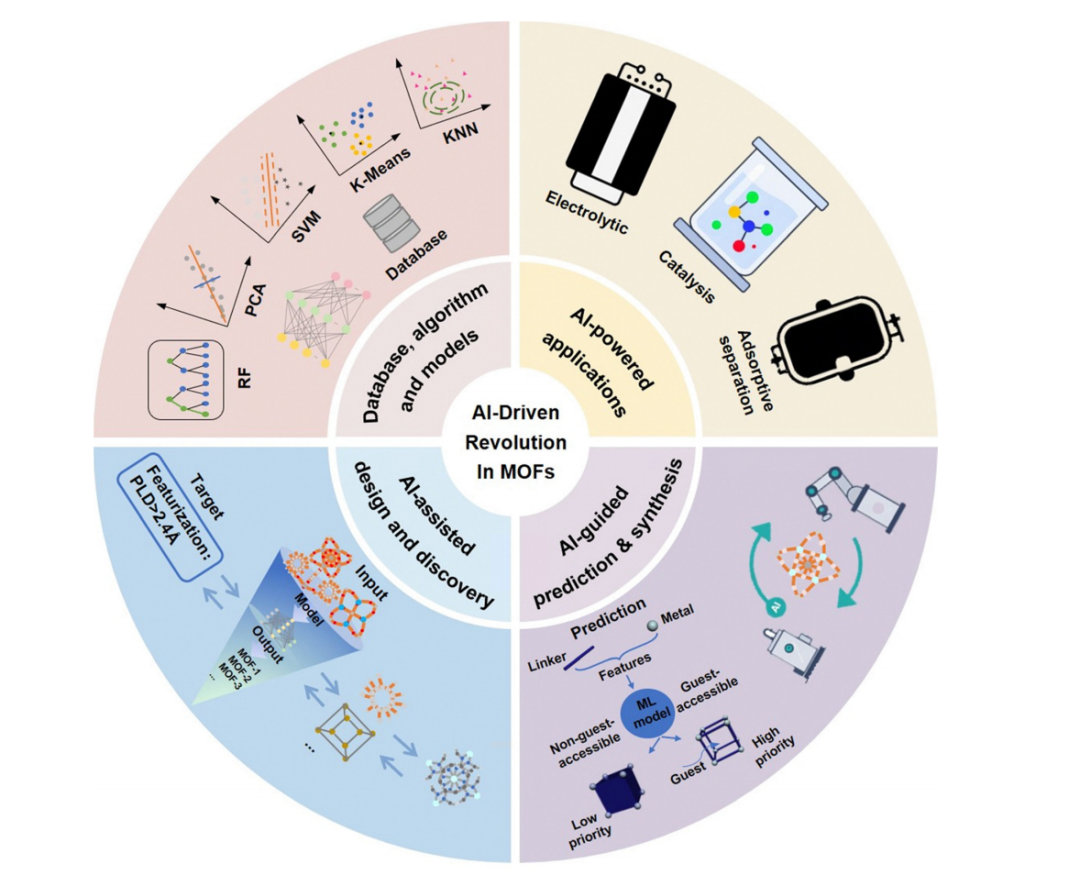人工智能驱动的金属有机框架材料设计、合成、性能预测及应用研究进展概念图