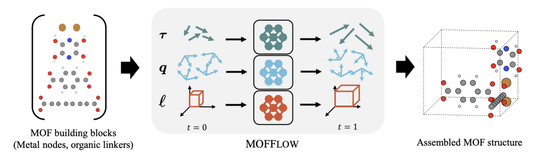 * 输入 MOFFlow 模型,设定简单的先验分布作为起点,定义从先验到目标结构分布的变换目标,采用流匹配框架学习,将随机构件合理排列;