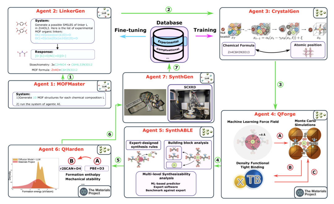 2025 年 4 月,Omar Yaghi 与加州大学伯克利分校的其他研究人员则推出了集成 LLM、扩散模型(diffusion)、量子力学代理、合成可行性预测器等模块的 Agentic AI 系统「MOFGen」,用于从头生成 MOF 结构,并对结构进行筛选验证。MOFGen 工作流程分为 7 个步骤: