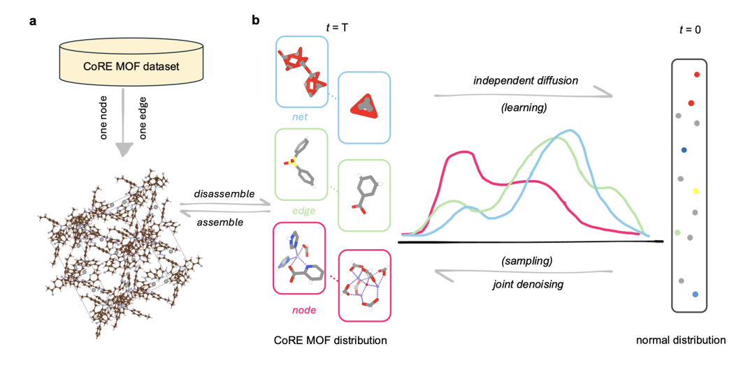 * 从随机噪声中采样,逐步去噪并恢复节点与配体的位置,基于PORMAKE 工具将这些构件重新组装,生成完整的 MOF 三维结构。