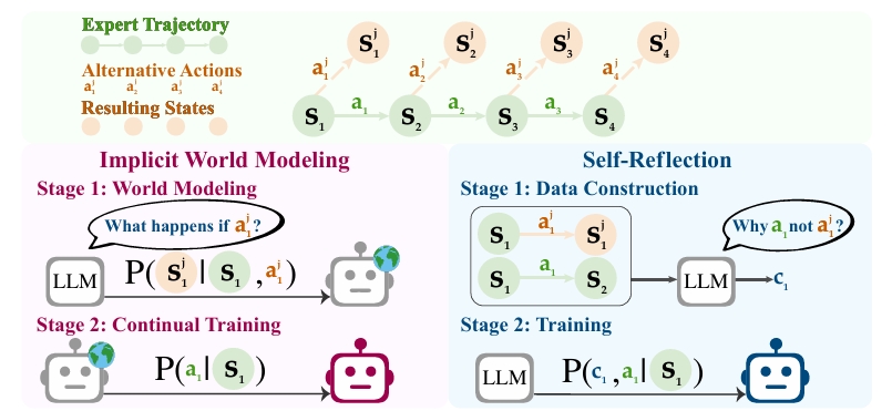 语言智能体的长期目标是通过自身经验不断学习与优化,最终在复杂的真实世界任务中超越人类表现。然而在许多环境中,仅依靠经验数据并使用强化学习训练智能体仍面临巨大挑战,这些环境或缺乏可验证的奖励信号(如网页交互),或需要低效的长时程轨迹回放(如多轮工具使用)。因此,当前大多数智能体仍依赖专家数据的监督微调,但这种方法难以扩展,且泛化能力较差。