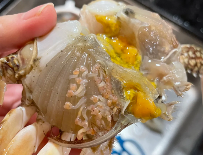 有网友打开梭子蟹后,发现内部有很多不明生物在蠕动,认为梭子蟹里有很多寄生虫,不能吃。