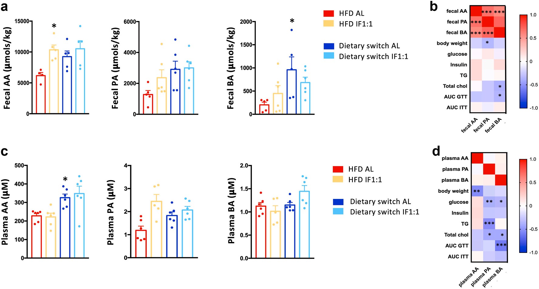 图4:瘦型和肥胖小鼠以及饮食干预后的短链脂肪酸餐后反应。