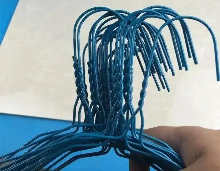 制作工艺简单,只需要一台衣架成型机,把已经有一层外皮的铁丝拧转好就行。