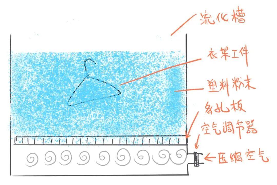 流动浸塑的原理是在这个流水线底下通压缩空气,只要控制好力度。整个粉末有点类似于流沙的效果,不会往外噗噗吹,只会在内部流动着把工件完全裹住。