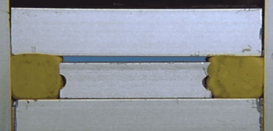 而给内芯小饼坯压出凹槽的原理,如下方的简化左视图所示。值得注意的是,工厂里本来是弯道的,这里简化成了直道,不妨碍我们理解原理。