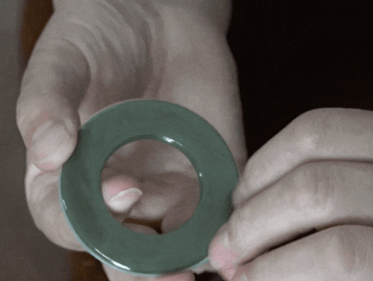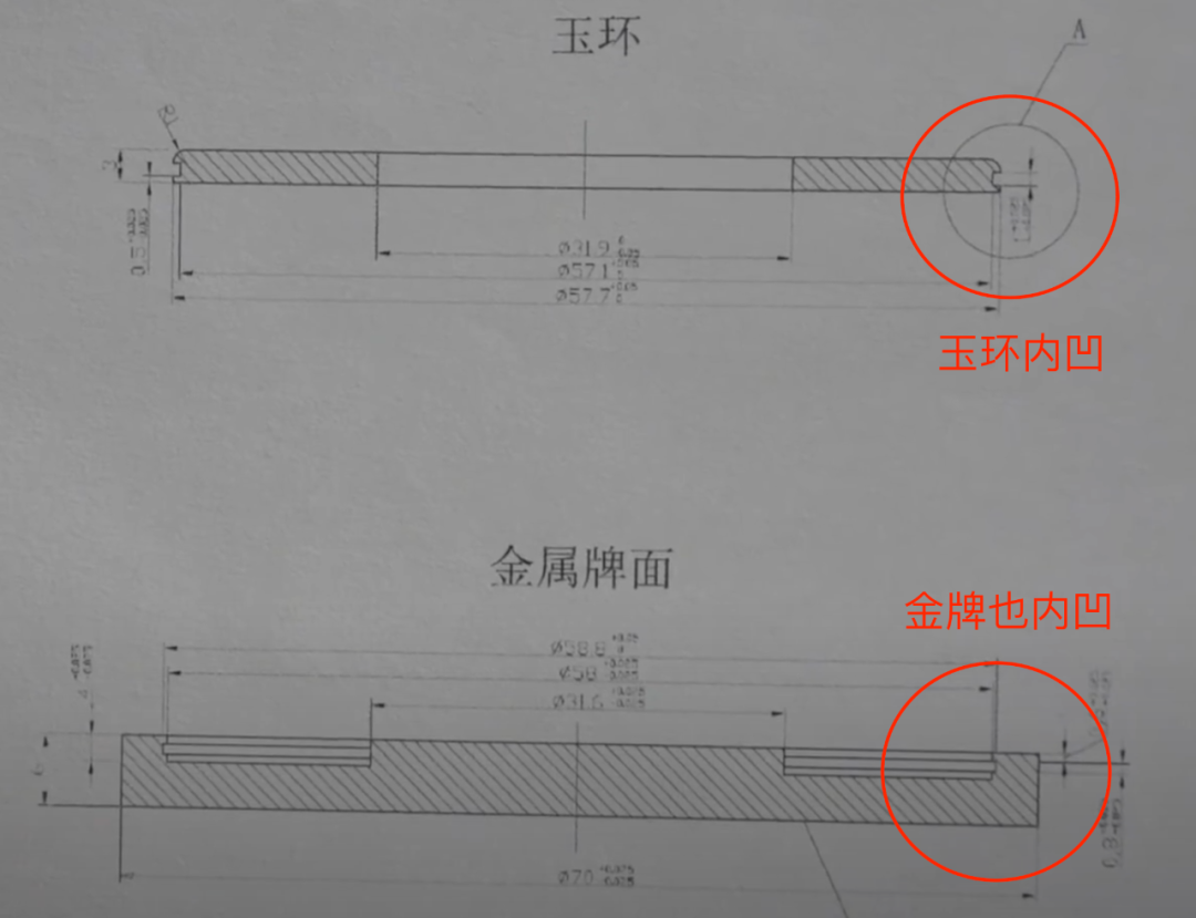 上图标记的内凹,是指在奖牌的金属环和玉环边缘均留有一圈沟槽。然后有一个卡在玉环和金属之间做缓冲的 O 型圈,见下图的实物展示。如果奖牌是竖着坠地,这中间物就可以消除掉振动波。