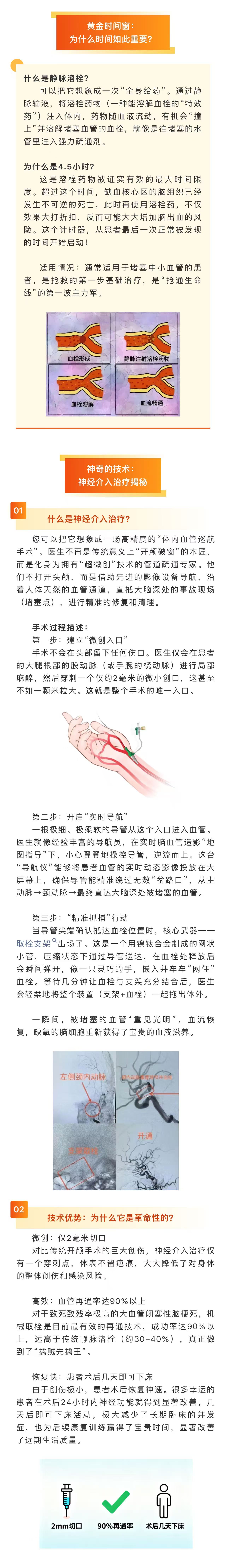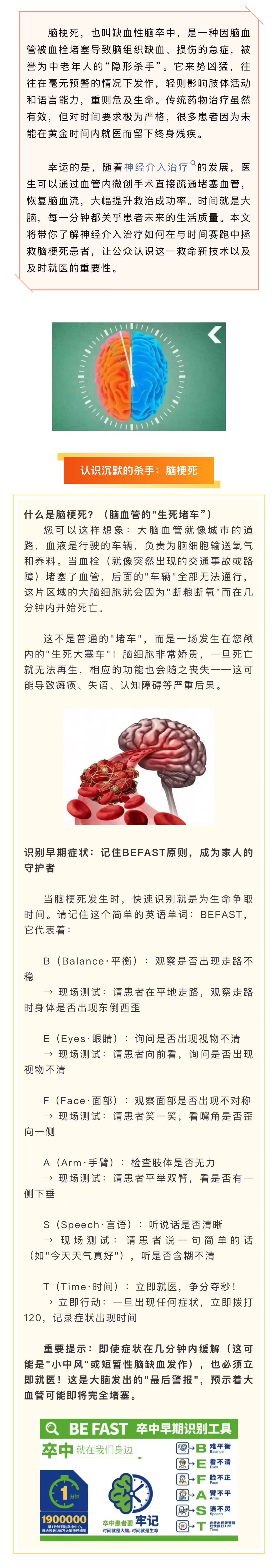 图文简介: 脑梗死也叫缺血性脑卒中,是一种因脑血管被血栓堵塞导致脑组织缺血、损伤的急症,被誉为中老年人的“隐形杀手”。随着神经介入治疗发展,医生通过血管内微创手术直接疏通堵塞血管,恢复脑血流,大幅提升救治成功率。