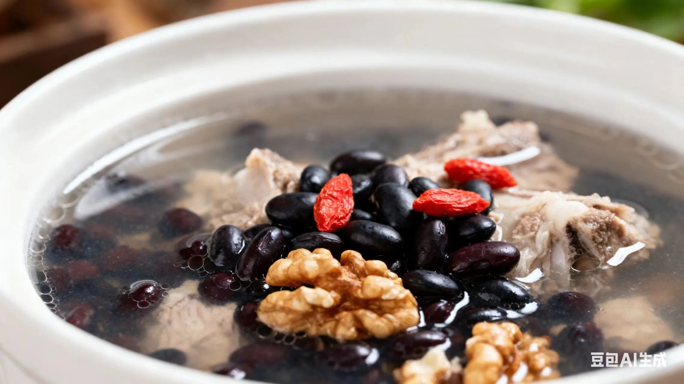 取黑豆50克、核桃仁30克、猪骨500克、枸杞15克,文火慢炖2小时,每周2-3次,适合全家食用。