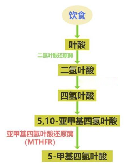 叶酸在二氢叶酸还原酶的作用下转化为二氢叶酸,然后再甲基化成四氢叶酸,接着与丝氨酸或甘氨酸的一碳单位结合,形成5,10-亚甲基四氢叶酸,通过亚甲基四氢叶酸还原酶(MTHFR)的催化后还原为5-甲基四氢叶酸,之后参与人体许多重要的生化代谢反应。而MTHFR基因位点存在基因多态性,MTHFR基因发生突变会导致MTHFR活性降低,引起叶酸代谢障碍,进而导致人体内同型半胱氨酸(Hcy)水平升高。同型半胱氨酸水平升高会导致血管内皮细胞受损,增加心脑血管事件的发生率,也会引起不良妊娠结局的发生。因此MTHFR基因对于各种相关疾病均有重要的意义。