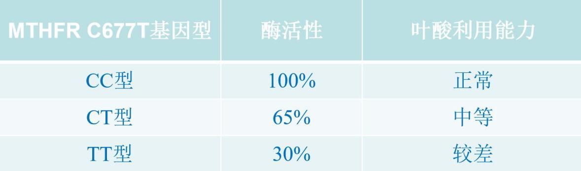 研究表明,相对于正常的CC型,在纯合突变TT基因型状态下酶活性可降低至30%,在杂合突变CT基因型状态下酶活性可降低至65%。就是说当某人基因为TT型时,他摄入或补充的叶酸只有30%可以转化成5-甲基四氢叶酸。所以TT型的人群因生成的5-甲基四氢叶酸的量少,从而极易发生高同型半胱氨酸血症。2016年发布的《H型高血压诊断与治疗专家共识》指出,MTHFR基因是H型高血压(高血压合并高同型半胱氨酸血症,Hcy≥16µmol/L)的独立危险因素。大量流行病学和临床研究都证实TT基因型和高同型半胱氨酸是脑卒中发生的独立危险因素。检测MTHFR基因多态性对高同型半胱氨酸血症患者补充叶酸、降低脑卒中发生风险具有指导意义。2017年《围受孕期增补叶酸预防神经管缺陷指南》中指出:对于无高危因素的妇女,建议从可能怀孕或孕前至少3个月开始,每日增补叶酸0.4mg(Ⅱ-1A)或0.8mg(IA),直至妊娠满3个月。而对于MTHFR 677TT的孕妇应实行个体化增补。对于患高同型半胱氨酸血症并携带MTHFR 677TT纯合突变的妇女,建议每日增补叶酸至少5mg,直至血液同型半胱氨酸水平降至正常后再考虑受孕,且持续每日增补叶酸5mg,直至妊娠满3个月(Ⅱ-3A)。MTHFR C677T基因双突变且有出生缺陷史的人群,建议从可能怀孕或孕前至少1个月开始每日增补叶酸4mg,直至妊娠满3个月(IA)。
