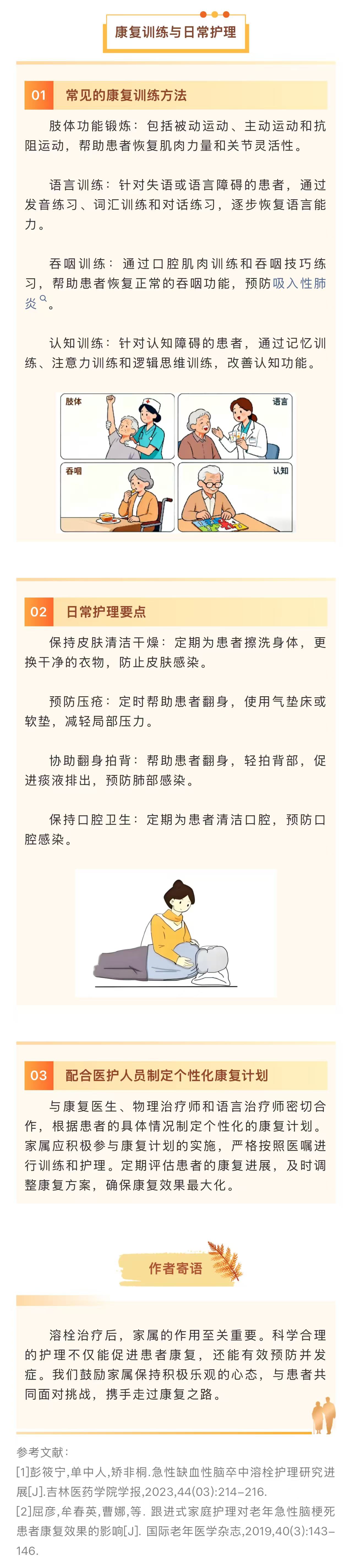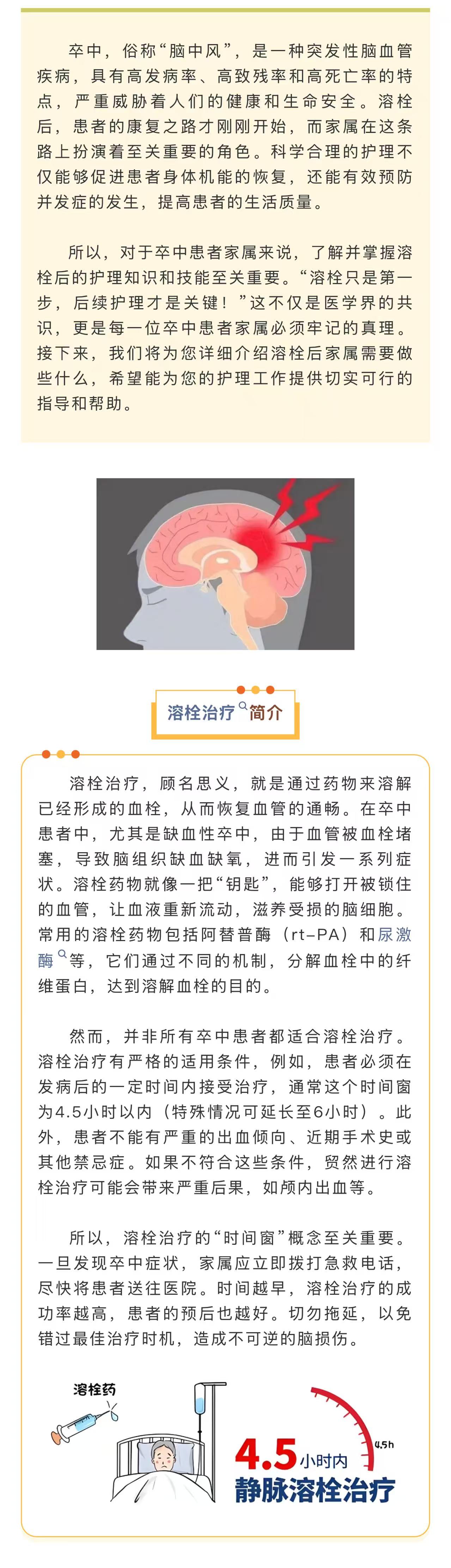 图文简介: 卒中,俗称“脑中风”,是一种突发性脑血管疾病,具有高发病率、高致残率和高死亡率的特点,严重威胁着人们的健康和生命安全。对于卒中患者家属来说,了解并掌握溶栓后的护理知识和技能至关重要。