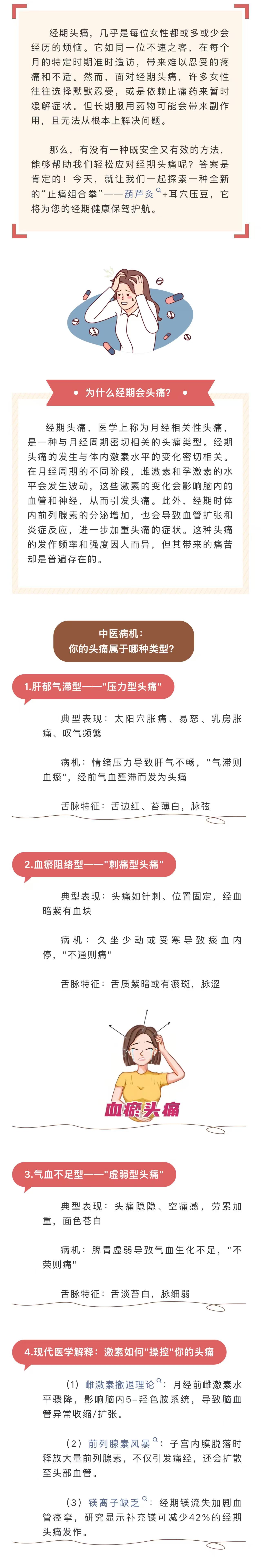 图文简介: 经期头痛,几乎是每位女性都或多或少会经历的烦恼。在每个月的特定时期准时造访,带来难以忍受的疼痛和不适。一种既安全又有效的方法,一种全新的“止痛组合拳”——葫芦灸+耳穴压豆,它将为您的经期健康保驾护航。