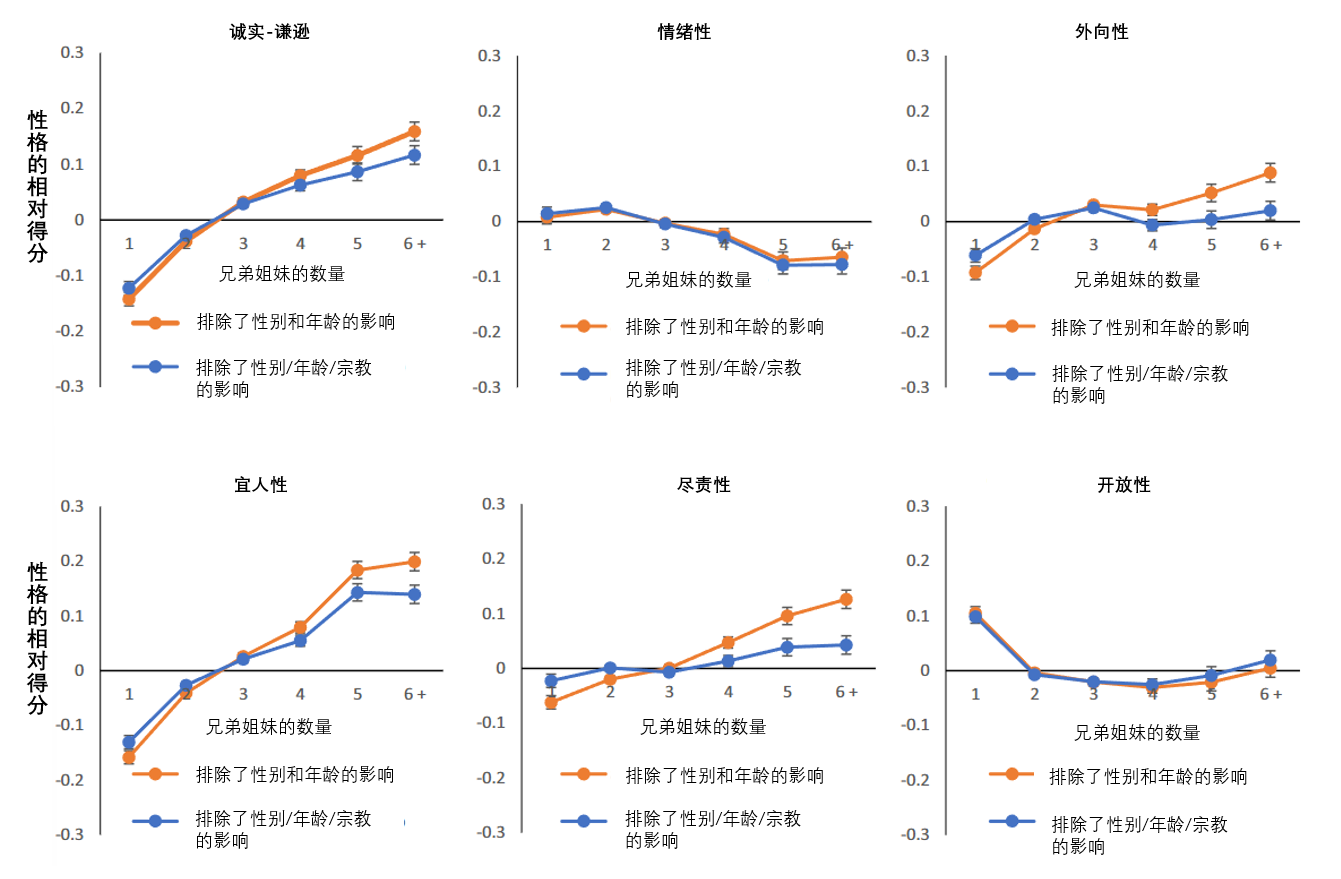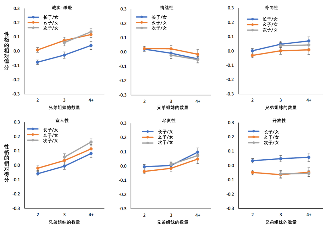 而在2025年发表的一篇最新的大规模研究中,心理学家通过对超70万人的性格和家庭结构进行了分析,更加清晰可靠地得出了这个问题的答案。他们收集了参与者的兄弟姐妹数量信息,并采用了一种叫做HEXACO人格模型的方法评估了他们的性格,这个模型基于心理学界广泛认同的大五人格特质理论,并增加了一个新的维度,一共包括诚实-谦逊、情绪性、外向性、随和性、尽责性和开放性这六个维度。