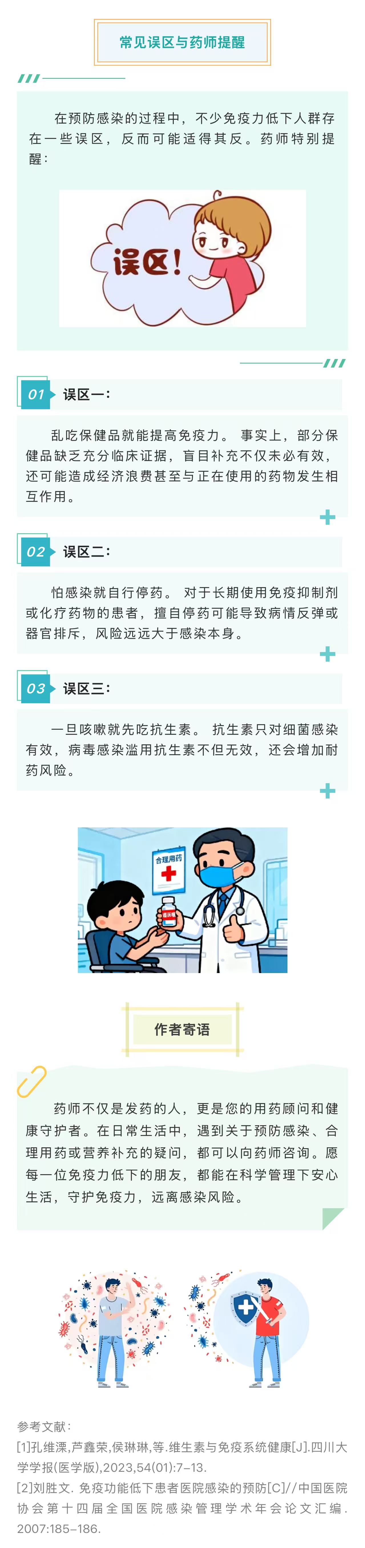 图文简介: 免疫系统是身体抵御细菌、病毒等病原体的防线,一旦功能减弱,就意味着抵抗力真正下降。在免疫力低下人群身上,可能迅速恶化,发展为重症,甚至危及生命。我们该如何科学地保护自己降低感染风险?就让药师为您支招。