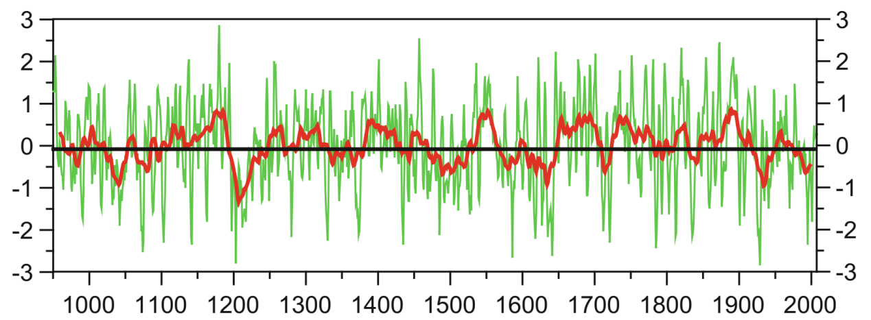 若将时间尺度拉长到千年,这场 “拉锯战” 会呈现出更清晰的准周期性规律。北大季风环境团队通过整合中国千年旱涝文献记载、代用气候资料与仪器观测数据,重建了东亚季风强度的千年变化序列,并发现了一系列关键规律 [5]。