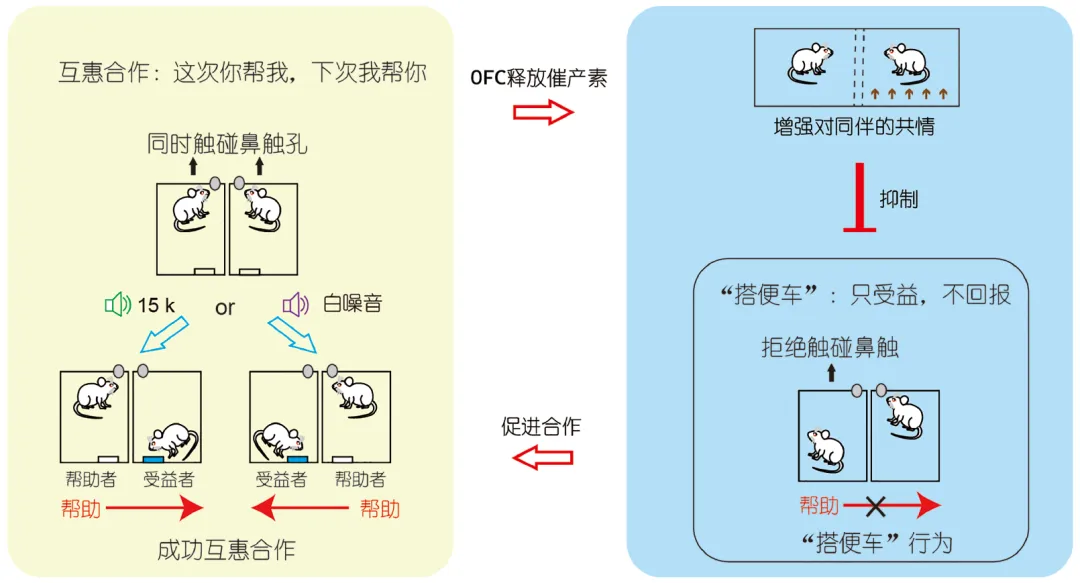 那这种共情能力是怎么来的呢?科学家们把目光投向了大脑中的一种神经肽——催产素。仅仅听这个名字,很多人都知道催产素和女性分娩及母爱有关,但这只是催产素最早被发现的功能。其实,催产素不仅女性有,男性也有,它是一个将社交信号增强的放大器,在社会交往行为中发挥着多方面的重要作用[6]。这次研究发现,催产素在合作行为中也扮演关键角色。科学家发现:在大鼠进行互惠合作任务时,它们大脑中的高级中枢眶额叶皮层(orbitofrontalcortex,OFC)区域会释放大量催产素,远高于单独任务或协同合作任务。更神奇的是:缺乏催产素的大鼠(基因敲除鼠)不仅学得慢,还更容易“搭便车”——不愿意帮忙,也不容易共情。这说明:催产素通过增强共情,抑制了“搭便车”行为,让合作更稳定。