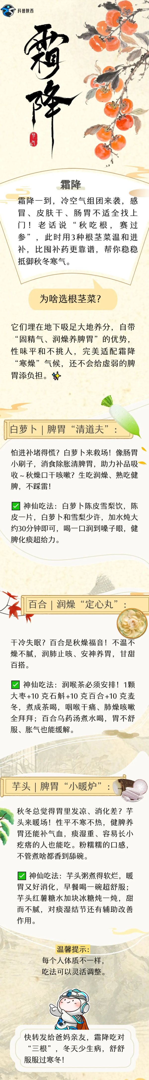 图文简介: 霜降临,寒意渐浓,秋燥未消,正是养生“黄金窗口期”。老话“秋吃根,赛过参”藏着古人的养生智慧,根茎类食材得大地滋养,平和润燥又养脾胃,是应对此时寒燥气候的绝佳选择。