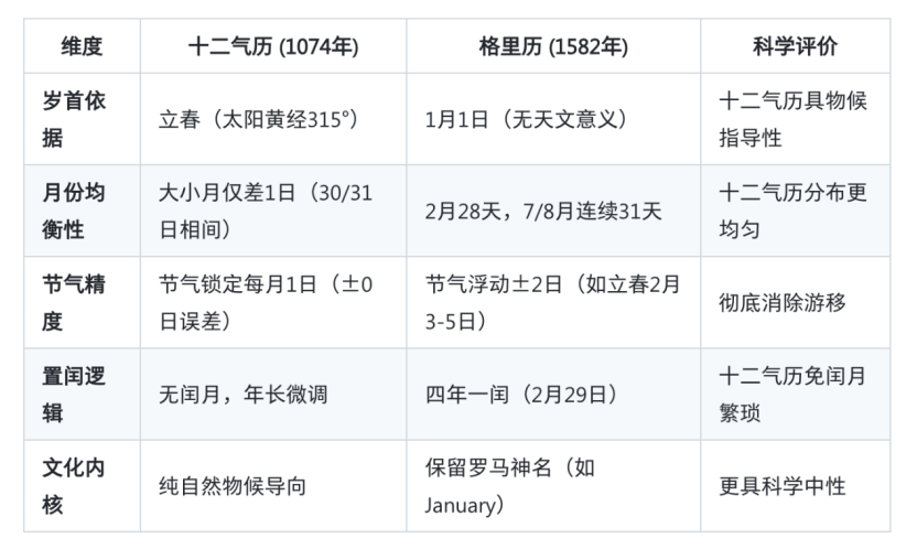沈括的十二气历不仅比格力高利历早约500年,而且采用24个节气作为历法的基准更具有科学性。公历虽然是一套纯阳历,却与实际天文天象没有太大实质关系。现代测算显示,纯阳历的冬至点漂移约每128年1日,优于儒略历的每128年1.5日误差。