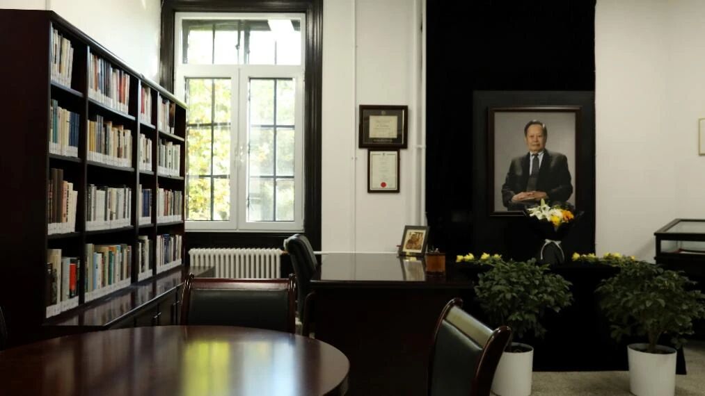 书屋一角还原了杨振宁在清华大学高等研究院的办公室场景,从家具布置到实物摆设,力求呈现他生前伏案工作的原貌,为参观师生营造一种跨越时空的对话感和亲切感。步入书屋,仿佛能感受到杨振宁那份严谨的治学态度、深厚的爱国情怀和心系母校的深情厚谊。