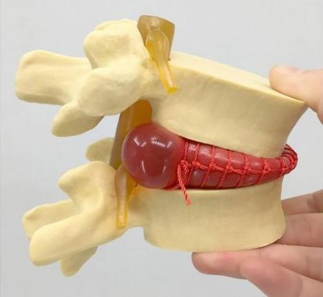 结果就是:“旗杆”歪了,“橡胶垫圈”被挤出来了,神经被压住了,椎间盘突出发生了。