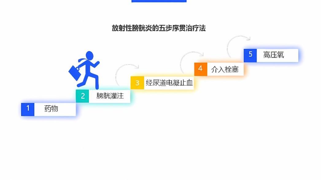 目前,临床针对放射性膀胱炎尚未形成统一的标准化治疗方案。常规治疗多采用药物膀胱灌注或手术止血等方法,但单一疗法效果常不够理想。有专家提出“五步序贯治疗法”,具体步骤包括:第一步药物保守对症治疗;第二步采用凝血酶溶液或透明质酸钠进行膀胱灌注;第三步实施经尿道电凝止血术;第四步进行介入栓塞术;第五步则采用高压氧治疗。