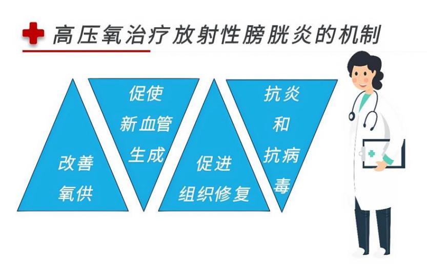 他非常开心,好奇地问道:“为什么高压氧治疗能够缓解放射性膀胱炎的症状呢?”目前,高压氧治疗放射性膀胱炎的作用机制已得到初步阐明。首先,高压氧可显著提高组织氧供应,增强膀胱壁氧张力。通过增加血浆中溶解氧的浓度,使受损膀胱组织的氧分压上升,从而有效改善缺氧状态,增加氧储备。其次,该疗法能够促进膀胱组织内新生血管的生成,改善组织的供氧情况,进而促进组织的修复。在高氧环境中,血管内皮细胞和成纤维细胞增殖活性增强,有氧代谢得以改善,从而推动毛细血管再生,重塑健康微环境。此外,高压氧还具有一定的抗感染和抗病毒作用,能够减轻膀胱的炎症反应,从而保护膀胱功能。